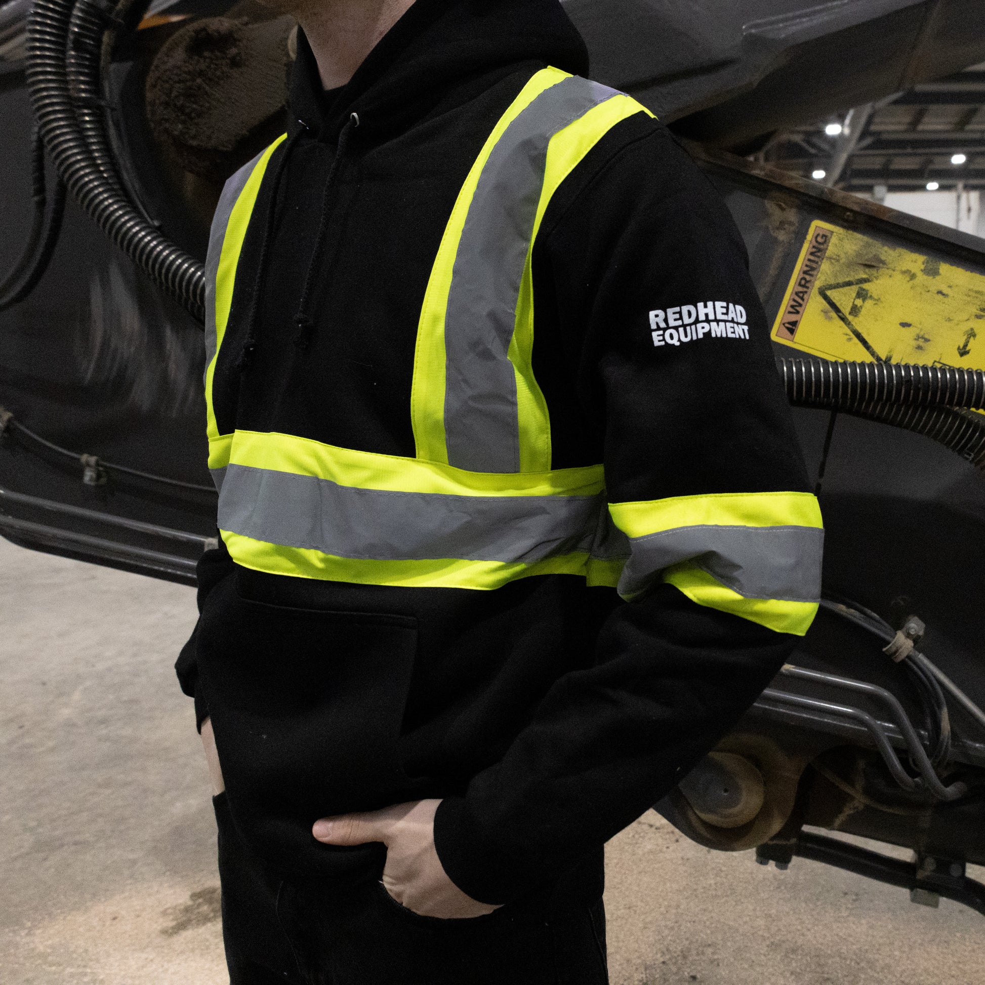 Stay visible and comfortable in this black hi-vis hoodie that keeps you seen without sacrificing style. The bold reflective striping catches light from every angle, making you impossible to miss on job sites or evening commutes. Soft, durable fabric pairs with a cozy hood for those chilly workdays. Whether you're clocking overtime or heading out after dark, this hoodie delivers the safety gear you need with an attitude that says you've got this.