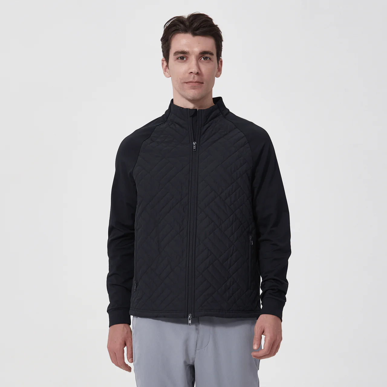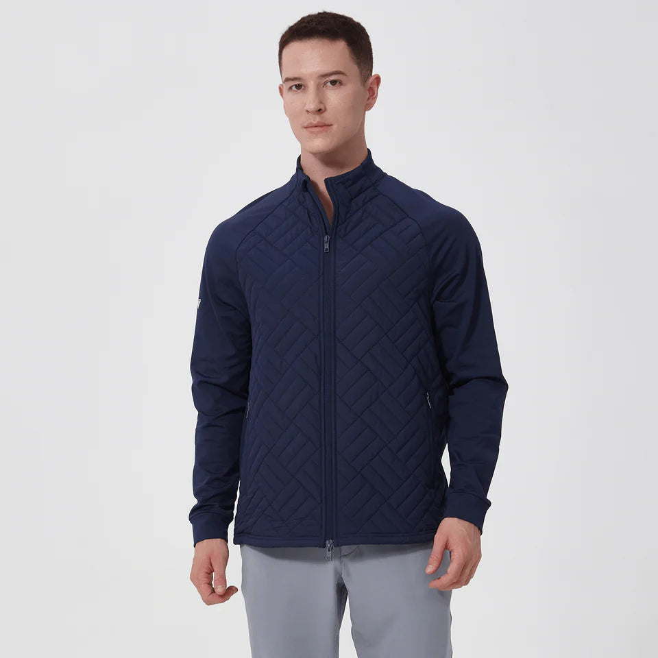 PRE ORDER ONLY Brave the elements with the Explorer, meticulously crafted to blend sustainability with enduring design. Made from 91% recycled polyester and 9% spandex, this piece emphasizes our dedication to eco-friendly practices. It incorporates moisture-wicking technology to keep you dry and comfortable in diverse weather conditions, while the anti-static and anti-pilling fabric ensures long-lasting wear and a clean appearance. The quilted contrast front panels not only add a touch of style but also enhance insulation. A two-way front zip with a stand-up collar provides adaptable coverage and protection against the wind. Zippered front pockets securely store your essentials, and the bungee cord adjustable hem allows for a customized fit. Whether you are on a weekend adventure or on the golf course, the Explorer is built to protect and perform.