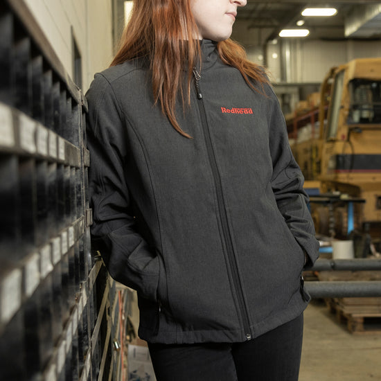 A women's softshell jacket designed for adaptability in any athletic output. This grey jacket comes with a red stitched Redhead logo on the left chest panel and does not come with a hood.
