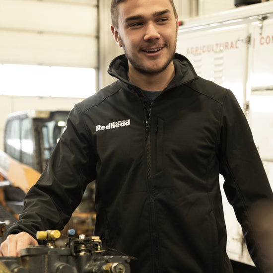 A men's softshell jacket designed for adaptability in any athletic output. This jacket comes with a white or red stitched Redhead logo on the left chest panel and does not come with a hood.