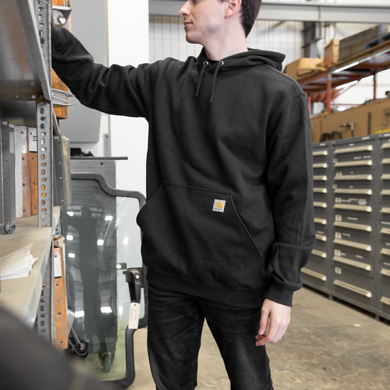 Embrace the comfort and durability of the Unisex Carhartt Midweight Workwear Hoodie. Made with a cotton-polyester blend, this hoodie features Carhartt-strong, triple-stitched seams, a three-piece hood with drawcord, rib-knit cuffs and waist, and a spacious front handwarmer pocket. Stay warm and stylish with the iconic Carhartt patch sewn on the pocket.