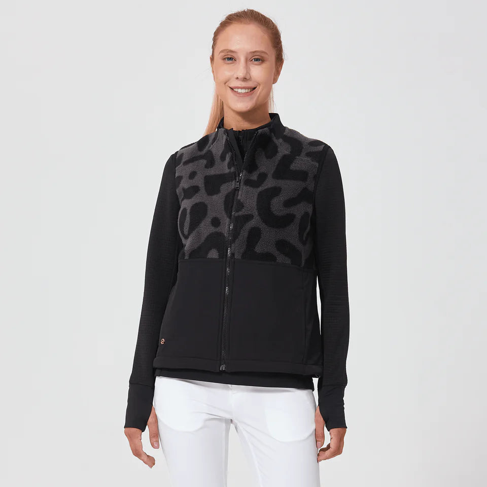 Make a statement with the Verve The Spot Vest, featuring a bold black and leopard print design with a stacked logo on the chest. Crafted from 100% polyester with contrast stretch nylon (polyester/spandex blend), this vest delivers comfort and durability. The ribbed collar trim and elastic binding at the armholes provide a refined fit, while functional front inseam zipper pockets keep essentials secure. Adjustable bungee cord at the body hem allows for a customized silhouette. Perfect for layering or wearing solo, this versatile piece transitions seamlessly from casual to street-ready style.