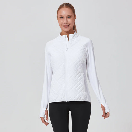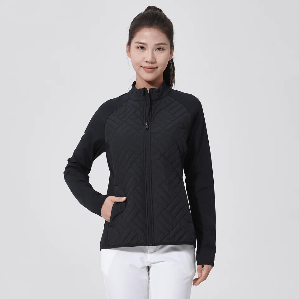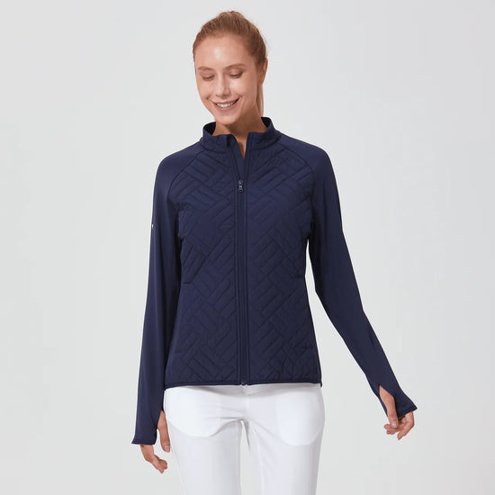 PRE ORDER ONLY The women's Explorer jacket is the ultimate outerwear choice for both golf and active pursuits, designed with both functionality and sustainability in mind. Made from 91% recycled polyester and 9% spandex, this jacket features polyester fill for added warmth without the bulk, ideal for layering. It's engineered with moisture-wicking properties to keep you dry, anti-static to prevent clinging, and anti-pilling to ensure it remains looking new over time. The quilted contrast front panels provide a stylish touch, and the full front zip with a stand-up collar offers adjustable coverage and protection from the elements. Additional practical features include zippered front pockets for secure storage, thumbholes on the cuffs to keep sleeves in place, and a high-low hem detail for enhanced coverage and mobility. Whether you're hitting the golf course or engaging in other outdoor activities, the Explorer jacket is tailored to support your active lifestyle.
